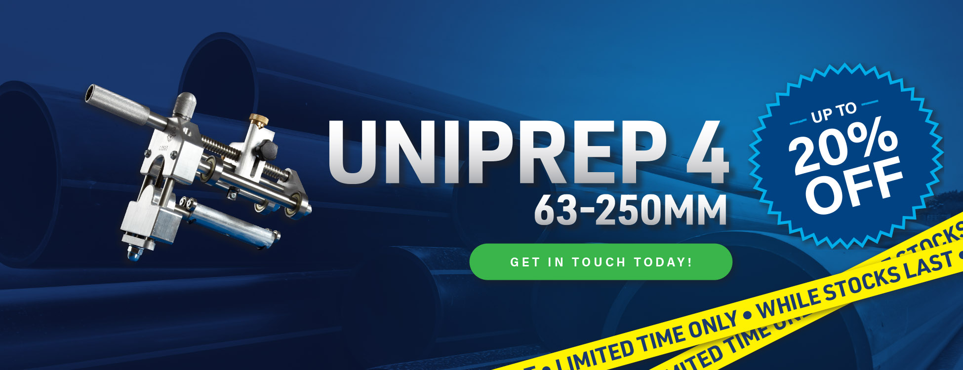 The Uniprep 4 is a scraping tool for all SDR rated pipe between 63-250mm. The tool features a 4 edge tungsten scraping tip and lightweight die-cast aluminum body construction.